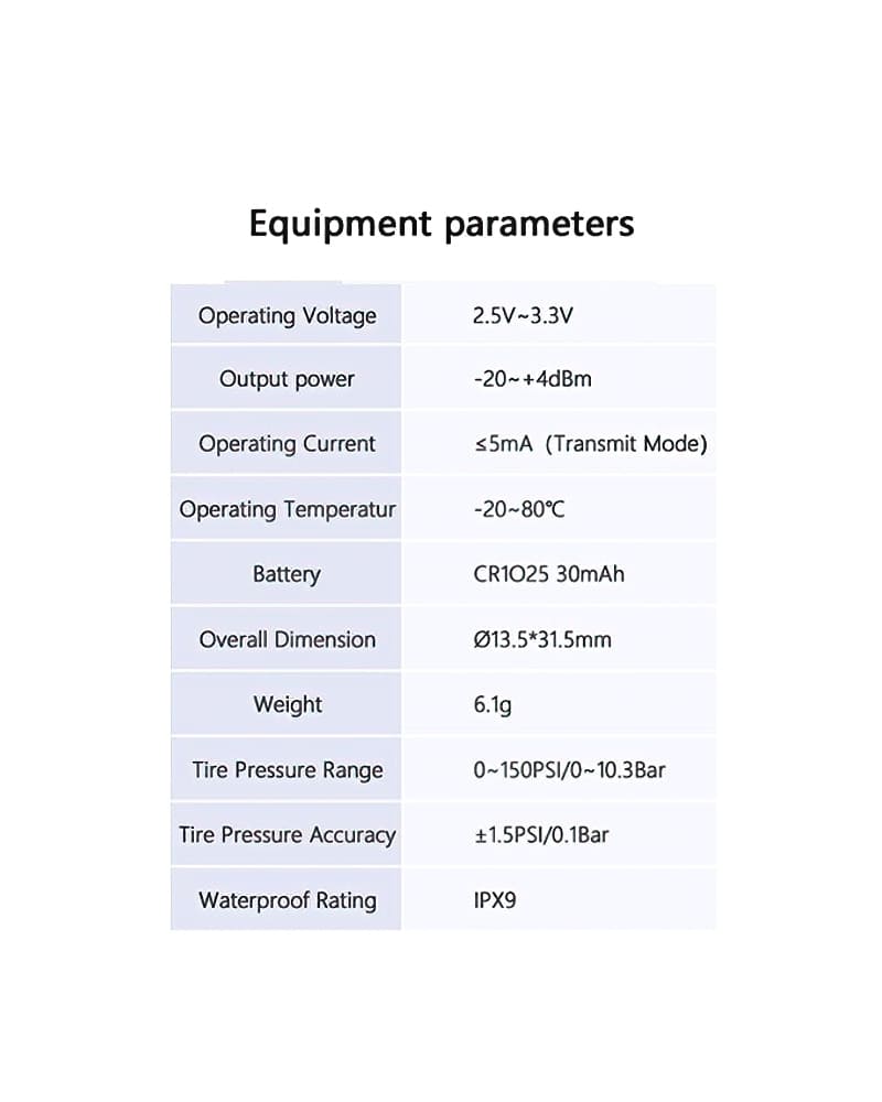 Tyre Pressure Range: 0~150PSI/10.3Bar